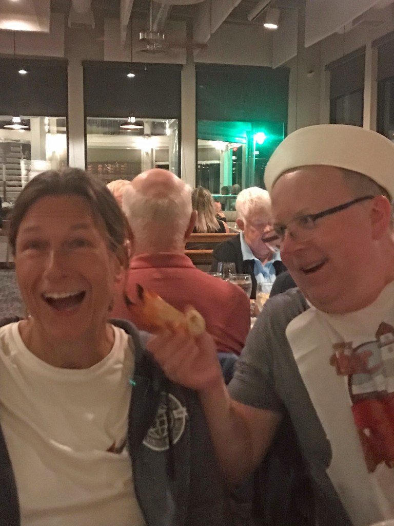 Ryan mastering small boat sailingJustin, Kat, Meg, and Paul at Tampa Bay Skyway BridgeDolpins in Pass-a-grille channelJim on lookout, Marcy at the helmMike is “king of the world”Evan at the helm through the bascule bridge on the ICWAmanda having fun in the Florida KeysClowning around at dinner after a long day of sailing!