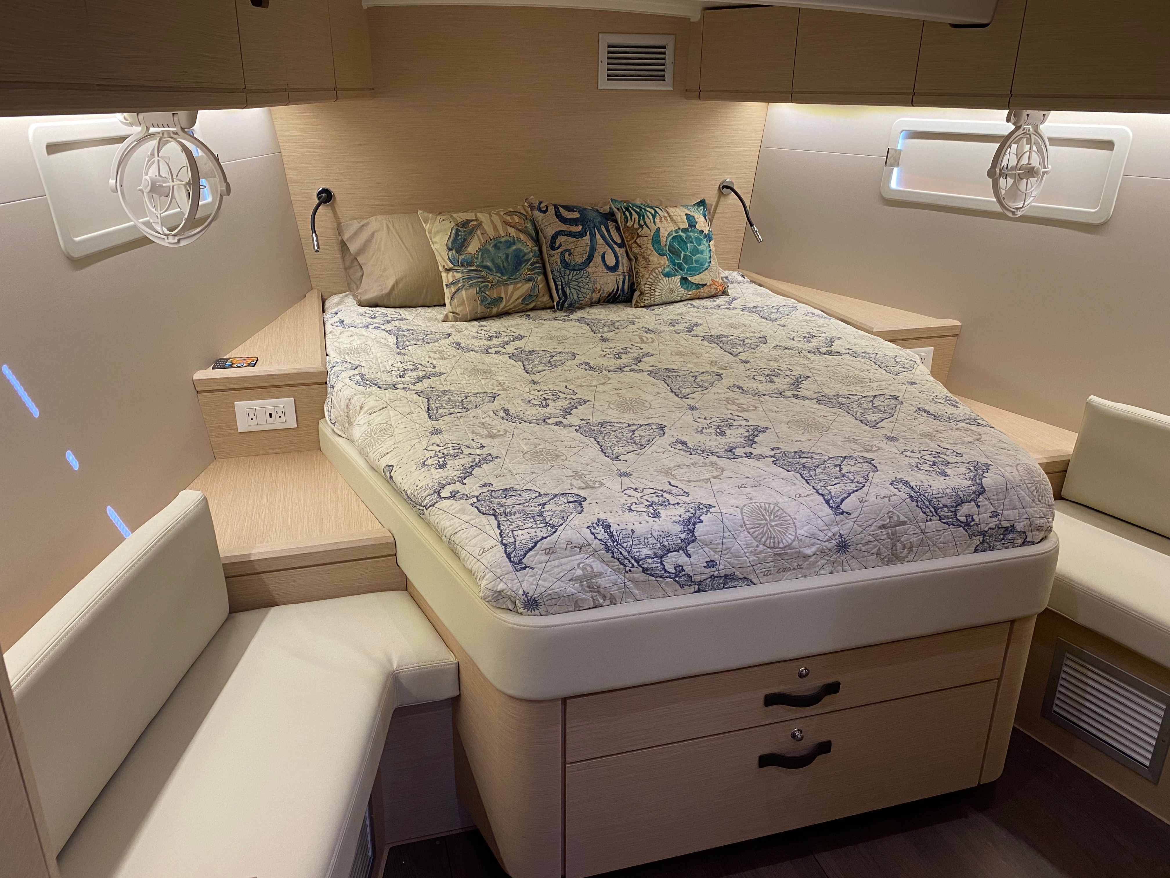 Koa has three staterooms (two queen sized berths and one double) and two full electric heads.